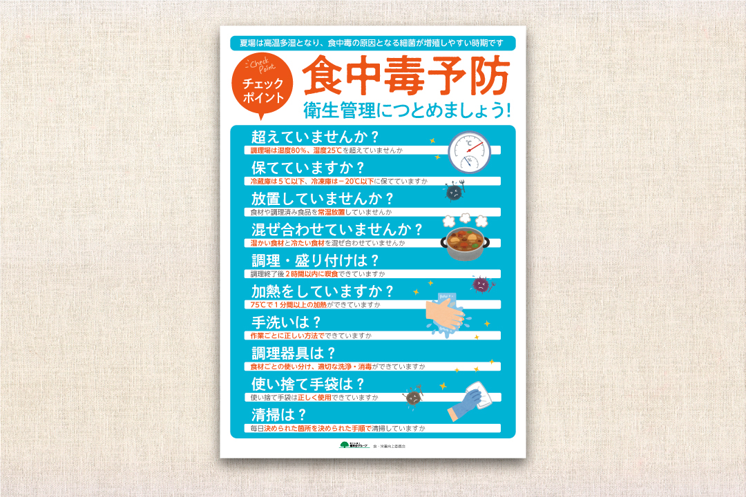 ポスターには、原因になる細菌やウイルスを「付けない、増やさない、殺菌する」という予防の3原則に則って、10のチェックポイントをわかりやすく表記しています。各施設の厨房に掲示して、予防意識と対策の徹底を図り、利用者様と園児たちの健やかな日常をしっかり守ってまいります。