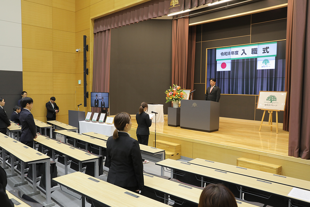 私は3つのことを大事にしています。それは「節目」「出会い」「きっかけ」です。訪れる「節目」と「出会い」を大切に、そして「きっかけ」をしっかり掴み取り、自分を成長させていってください。今日の入職式もまさに「節目」「出会い」「きっかけ」です。今日の日を「自らを成長させ、家族・友人を幸せにするきっかけ」と捉え、今日の日の初心を忘れず、グループの新しい風となってください。皆さんの活躍と輝かしい未来を祈念し、お祝いの言葉といたします。