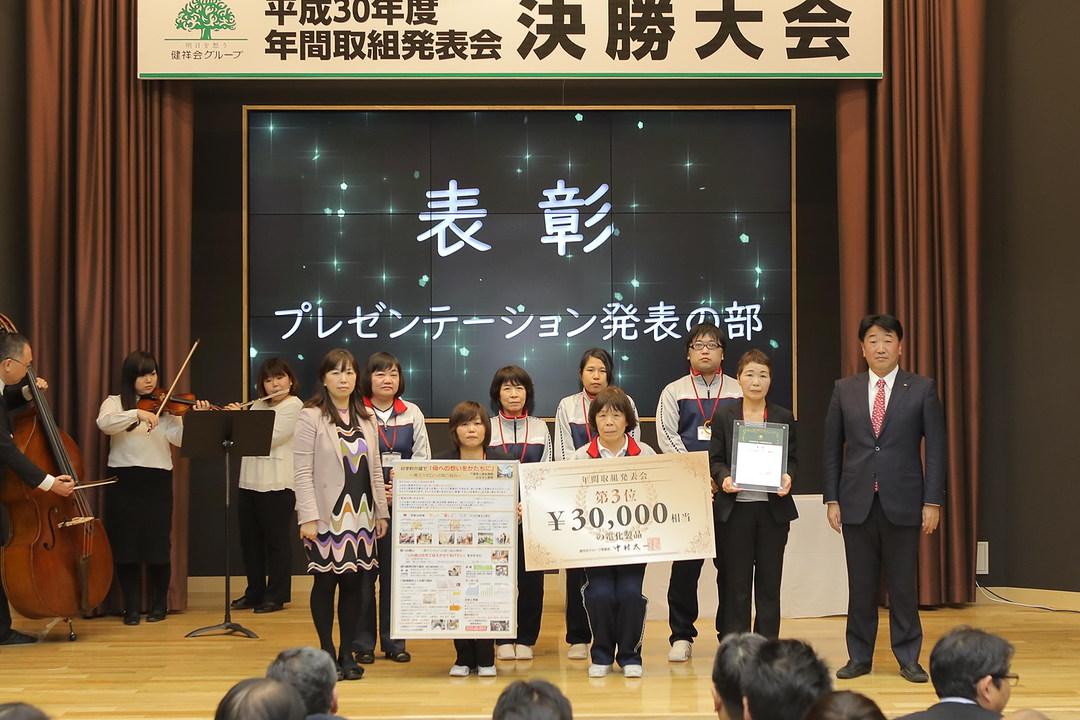決勝大会進出を果たしたのは、グループホーム濃姫、特別養護老人ホーム緑風会イサベル、老人保健施設健祥会ウェル、軽費老人ホーム健祥会ヴィラ、特別養護老人ホーム健祥会家康、グループホーム笑顔毎日、介護老人福祉施設ふるさと那賀、老人保健施設健祥会ハートの8施設です。施設職員・本部役職員に加え、専門学校健祥会学園の学生や4月から入職予定の新入社員も交えて、ホールは超満員。映像や音楽も駆使し、20分の持ち時間をフルに使って、1年間頑張ってきた取り組みと成果がプレゼンテーションされました。今年は、スペシャルゲストとして、業界紙シルバー新報・月刊ケアマネジメントの川名佐貴子編集長も取材にお越し下さいました。