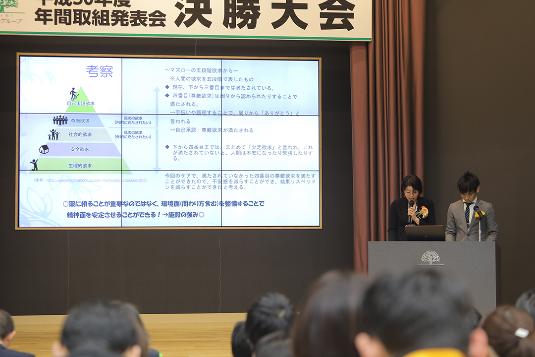 1年間の取り組みの成果発表の場として、本部経営戦略推進部と施設サービス力向上委員会、食・栄養向上委員会が主催して、年度末には年間取組発表会が開催されています。